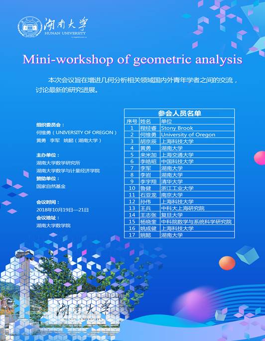 召开“Mini-workshop of geometric analysis”。会议拟邀请国内外高校院所几何分析相关问题的青年学者参会。本次会议由湖南大学数学与计量经济学院举办,受国家自然基金项目和主播视频