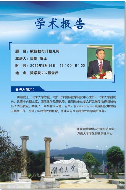 田刚院士,北京大学教授,现任北京国际数学研究中心主任、北京大学副校长、民盟中央副主席,国际数学联盟执委。田刚院士在复几何及数学物理领域做出了杰出贡献,解决了一系列重大问题,包括:在Kähler-Einstein度量研究中做出开创性工作,引进了K-稳定性的概念,并建立与几何稳定性的紧密联系等。