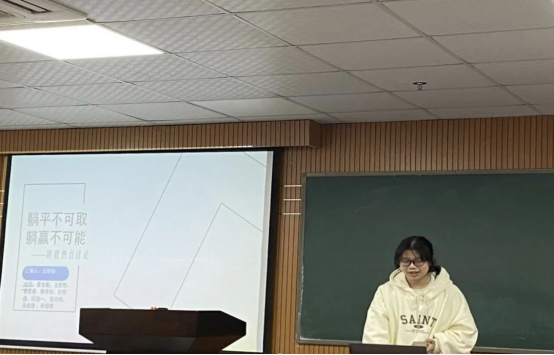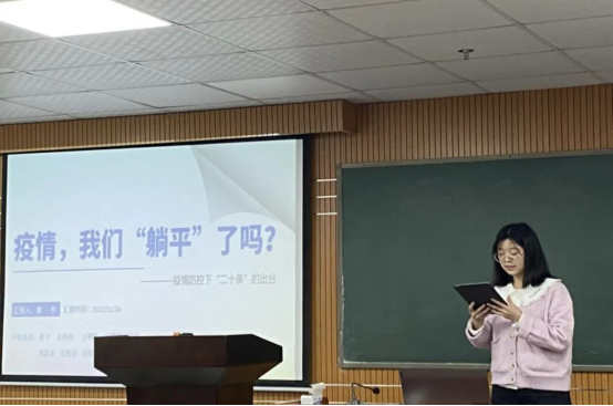 第四组由王欣怡同志进行分享,该小组讨论主题是疫情防控。以美国抗疫的躺平做法所引发的后果和我国疫情的严峻形势得出躺平不可取,躺赢不可能的结论,之后讨论了二十大所提出的二十条,最后进行总结。