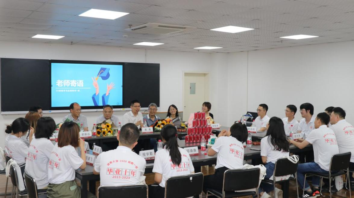 端午节之际,2009级数学与应用数学1班的校友回母校举行毕业十周年庆祝活动,他们拟定了活动的口号“十年磨一‘见’,再见仍是少年” ,全班聚集了十多位同学。大家先后登岳麓山,上爱晚亭,漫步学校校园,打卡学校标志。6月23日下午来到学院与老师们一起座谈交流,邀请了院党委书记蒋月评、院长黄勇、副院长郭振远,以及罗汉、肖映青、宋怀玲、朱郁森等7位当年任课的老师出席座谈会。