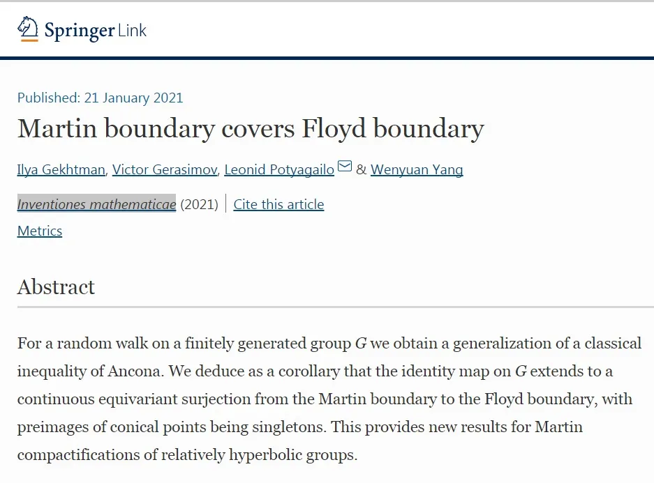 近日,北京国际数学研究中心杨文元研究员与合作者的论文《Martin 边界满射 Floyd 边界》(Martin boundary covers Floyd boundary)被顶尖数学期刊 Inventiones mathematicae 在线发表。