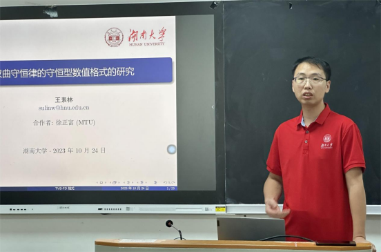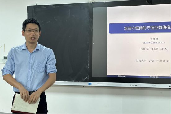 王素林老师作了《双曲守恒律的守恒型数值格式的研究》的报告,易雯帆副教授作了《非线性高振荡色散问题的高效数值方法及分析》的报告,并与到会的专家、教师展开了热烈的讨论和交流。