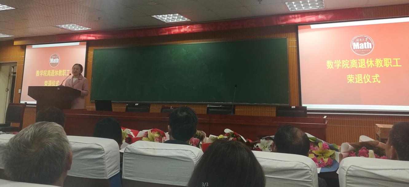 接下来欢送会进入高潮,八位退休教师上台,蒋月评院长和程卓蕾书记为每一位老师颁发了“光荣退休”的荣誉证书。年轻教师上台献花,这一幕意味着传承,数学院的接力棒也将逐步传递给年轻教师。献花结束后,胡跃荣老师作为退休教师代表上台,感谢学院领导和同事的关心。他说自己已经在湖大工作了一辈子,对主播视频
