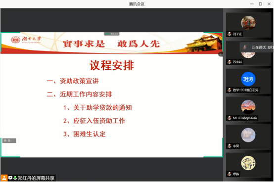 2021-2022学年度资助专题宣讲于腾讯会议晚21:00线上顺利开展。本次宣讲由数学院资助助管郑红丹介绍会议流程及主要内容,学院资助兼干、本科2018级辅导员张屾老师进行总结和补充,各年级资助学生干部及2021级全体新生参加。