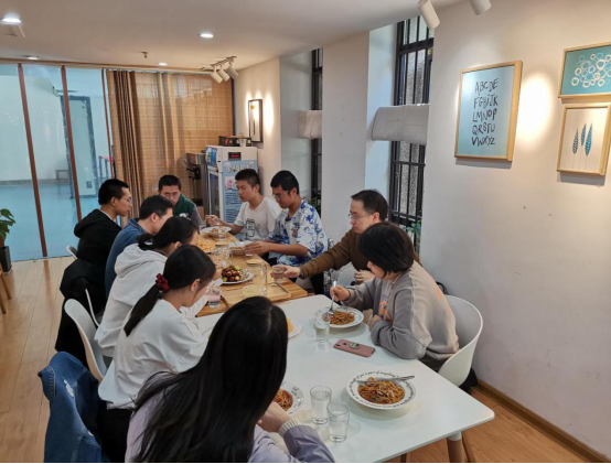 老师和同学们一边享受着美食,一边愉快的交谈着。接下来,雷老师又根据他多年的教学经验,向学委们指出宿舍文化对于学习意识的重要性。通常来说,保研的学生是以宿舍为单位的,这和平时的学习氛围密不可分。宿舍里一个同学玩游戏,可能会造成整个宿舍的懈怠。而如果舍友一起去自习,宿舍里就会形成良好的学习文化,这样的学习氛围才是理想的。作为学习委员,应当“挽救”玩游戏的同学,引导他们认真学习。