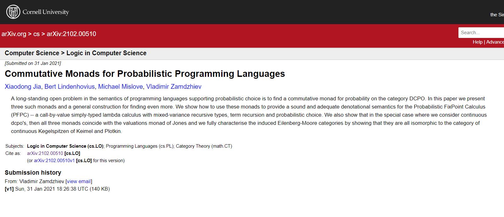 的贾晓东博士(第一作者)与合作者的论文“Commutative Monads for Probabilistic Programming Languages”在LICS2021发表。LICS(ACM/IEEE计算机科学逻辑国际会议,ACM/IEEE Symposium on Logic in Computer Science)是理论计算机科学领域最顶级的国际会议之一,成果代表着理论计算机科学的前沿,自1986年在剑桥大学首次举办至2020年,共计有9篇签署国内第一单位的论文在LICS发表。2021年,共3篇签署国内第一单位的论文被LICS接受,分别是中国科学院、复旦大学和主播视频