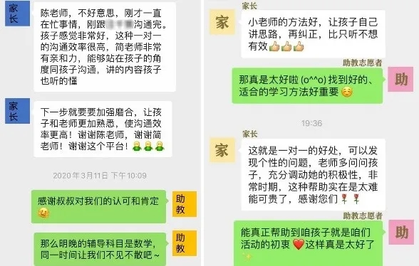 “这次我们真的看到,像你们这样的90后、00后,太了不起了!”“这种一对一的沟通效率很高,老师非常有亲和力,能够站在孩子的角度沟通,讲授内容孩子都能听懂!”“老师的方法很好,让孩子自己讲思路再纠正,充分调动了积极性,比只听不想有效”……家长们好评如潮。